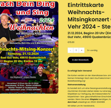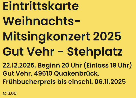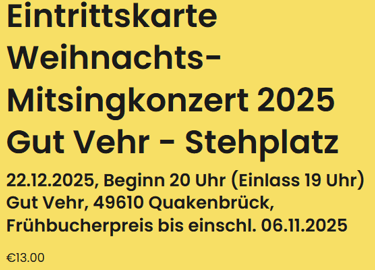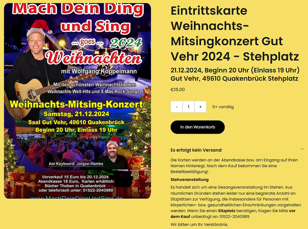 Die Karten werden an der Abendkasse bzw. am Eingang auf Ihren Namen hinterlegt. Nach dem Kauf bekommen Sie eine Bestellbestätigung.